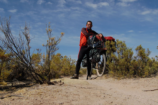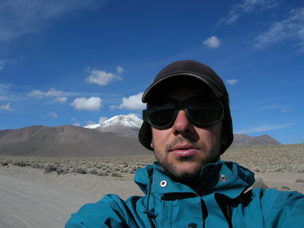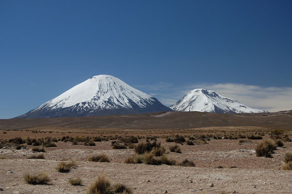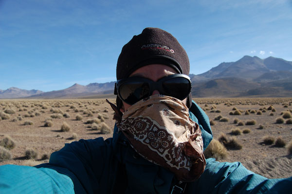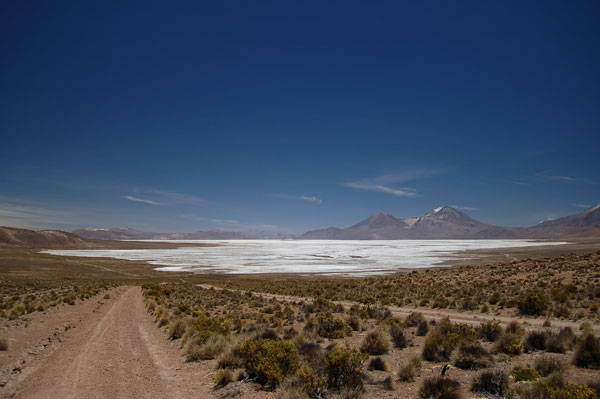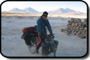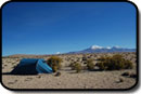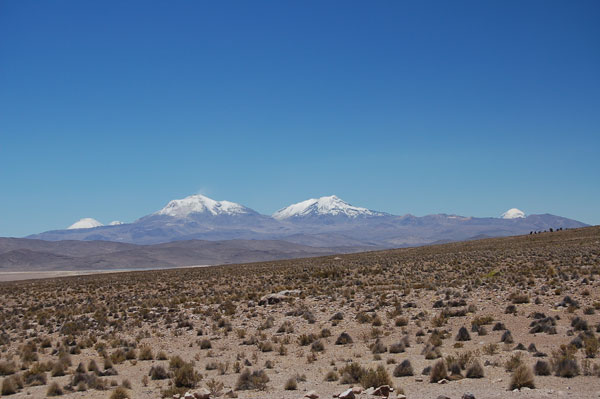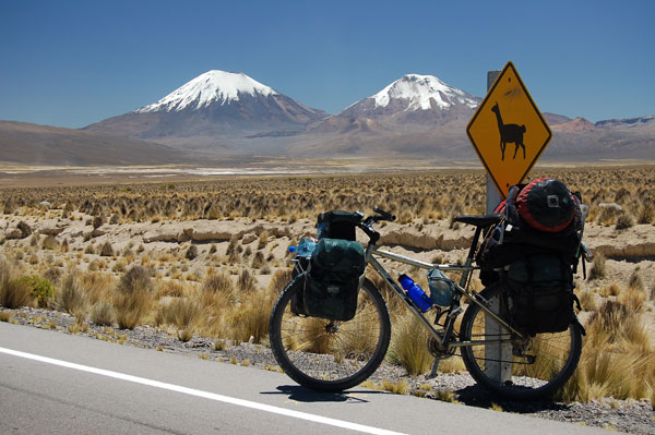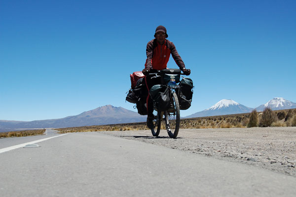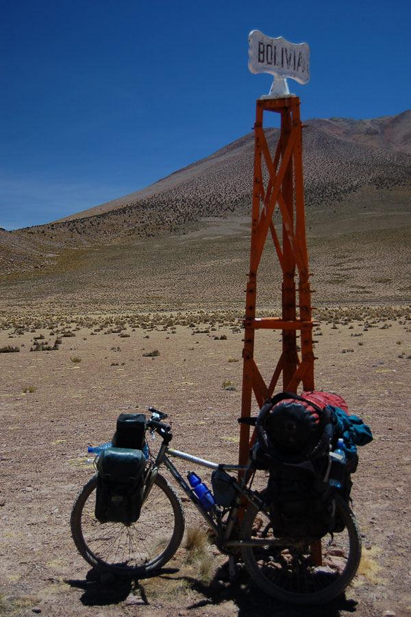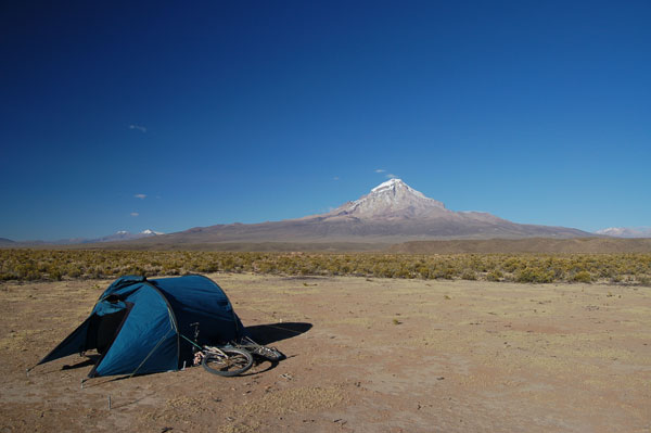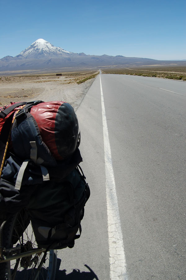Cu cât avansez spre graniţa cu Chile, peisajul devine mai arid, distanţele între sate tot mai mari şi satele tot mai mici iar drumurile mai proaste. De multe ori o iau pe poteci care sunt mai bune decât drumurile pentru camioane. Cum pentru zonele rurale din Bolivia nu prea există hărţi bune, prin sate trebuie să mă interesez de drumurile existente. Puţinii serranos, cum sunt numiţi locuitorii din munţi şi de pe platoul altoandin, pe care-i întâlnesc de-a lungul mă salută prietenos şi se bucură de o scurtă conversaţie cu un gringo (aşa sunt numiţi străinii). Locuitorii de aici se ocupă cu agricultura şi păstoritul de oi şi alpaca. Trec prin zone cu un peisaj spectaculos şi nu mă pot abţine să fotografiez la tot pasul ceea ce văd: abrupturi ravenate, văi largi, lacuri sărate secate şi crestele înzăpezite ale celor două lanţuri paralele ale Anzilor. Cortul mi-l pun de obicei acolo unde mă apucă noaptea, totuşi încerc să găsesc un loc plăcut, în cel mai bun caz departe de sat şi pe malul unui râu sau pârâu ca să mă pot spăla. După două zile am deja vederea liberă spre majestuosul vulcan Sajama, care se înalţă lângă vulcanii gemeni de pe partea chileană, Pomerape şi Parinacota. Sajama va fi punctul de orientare pentru următoarele 4 zile, când în plină pustietate la intersecţii nu e nici un indiciu în care direcţie trebuie să o iau. De două ori mă şi pierd şi trebuie să mă întorc pentru a lua calea alternativă. Pe penultima etapă înainte de satul Sajama mi se rupe mecanismul schimbătorului pe faţă şi sunt obligat să pedalez cu foaia mică încă 50 de km.