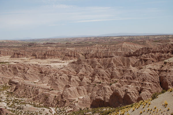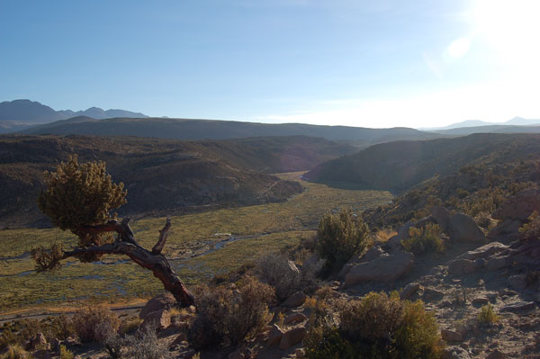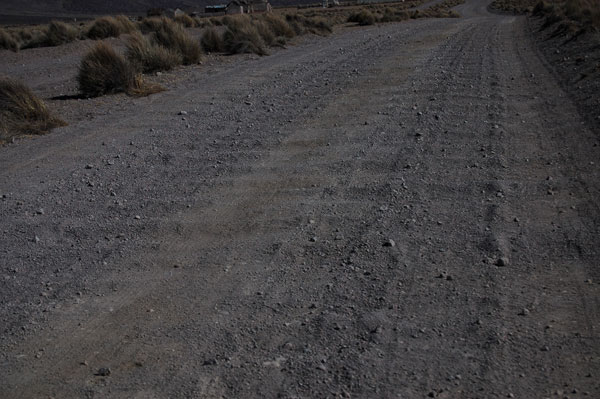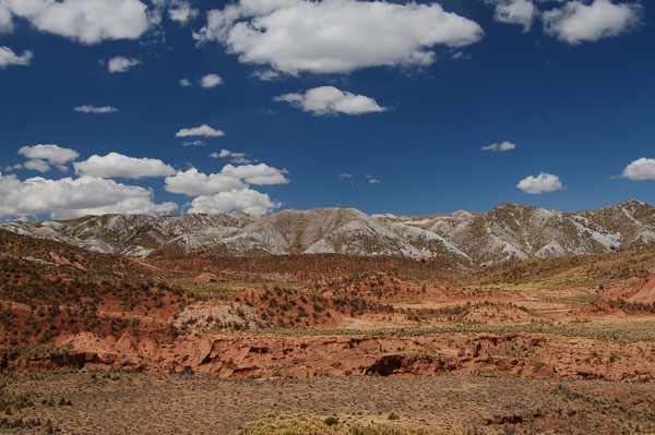 Peisajul cu dealuri domoale şi văi adânci, colorate de la un roşu puternic de argilă, la galbenul şi verdele deschis al rocilor sulfuroase contrastează puternic cu norii albi care împânzesc cerul albastrul intensiv la peste 4000 de metrii. La fel şi pajiştile uscate şi galbene cu zonele de „bofedales” umede şi verzi care sunt păscute de turme întregi de alpaca. Drumurile sunt foarte proaste, cu nisip fin în care se afundă roţile. La unele porţiuni aveam impresia de parcă m-aş da pe tablă ondulată. Aşa se face că nu reuşeam să parcurg mai mult de 50 de km pe zi.