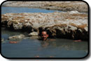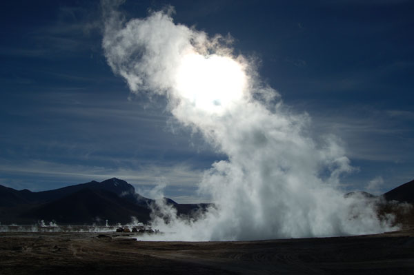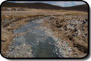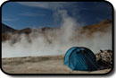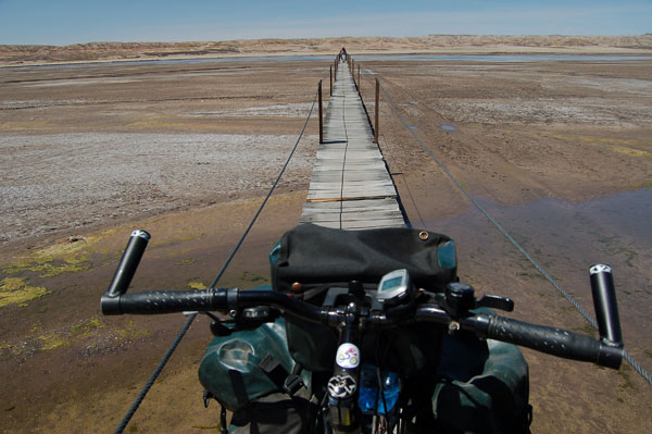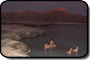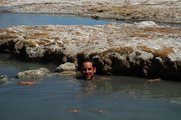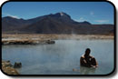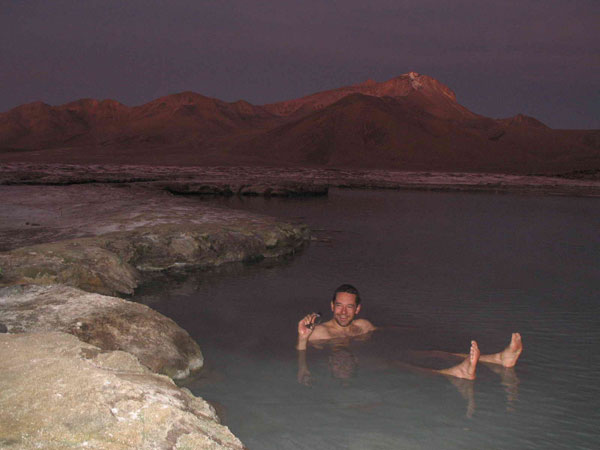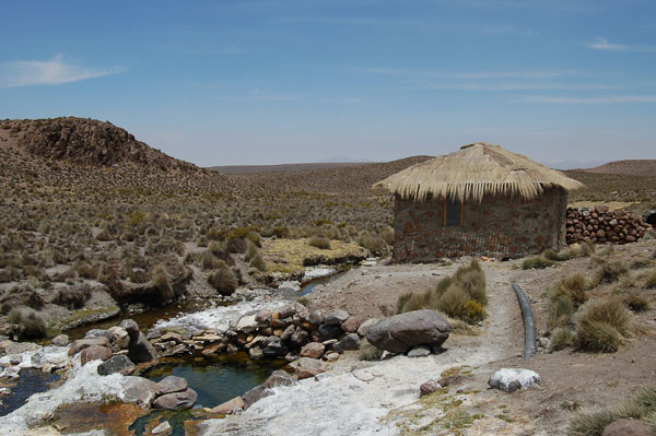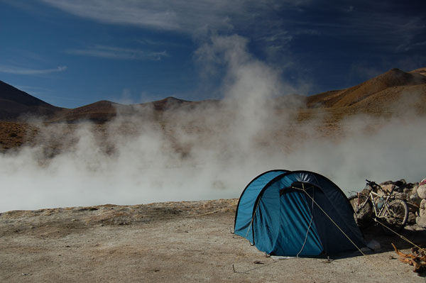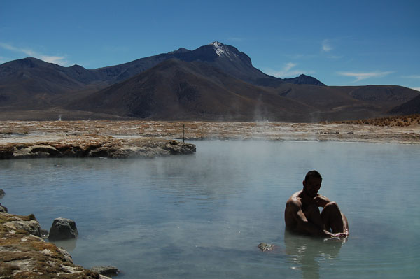 Încă patru zile pentru 200 km au urmat în şaua bicicletei, pedalând spre sud de-a lungul graniţei cu Bolivia. Zona parcului naţional Surire este cunoscută pentru mulţimea de izvoare termale, salaruri şi animale andine - vicuña, llama, puma, raţe şi gâşte. Mai ales izvoarele termale erau ceva fantastic, deoarece după o zi de pedalat la peste 4200 de m în astfel de condiţii, nu există nimic mai bun decât să faci o baie în apă caldă sub cerul liber. Asta am şi făcut la marginea salarului Surire, un imens lac de sare, pe alocuri secat, unde se află izvoarele termale Pollequere. Nu este nimica amenajat, doar o bancă cu o masă şi nişte pereţi de piatră care protejează locul de cort de vântul puternic. Acolo m-am instalat cu cortul şi am stat mai mult de o oră în apa caldă de peste 40 de grade. A fost probabil una dintre cele mai frumoase senzaţii pe care le-am avut în Anzi.