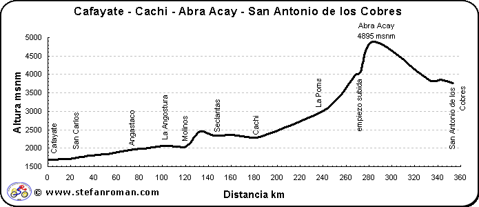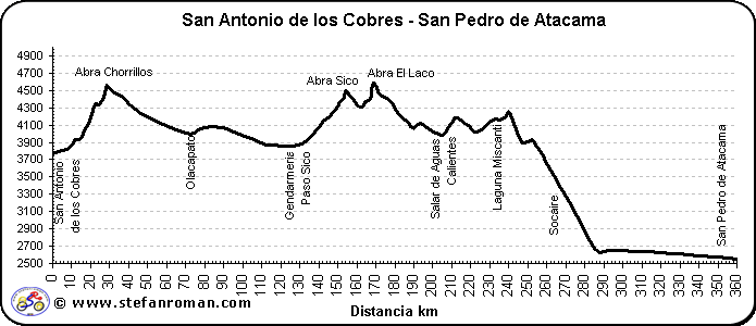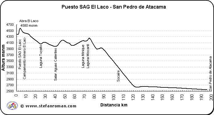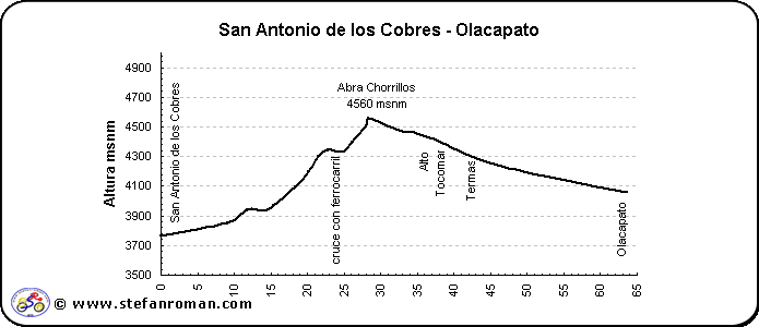 These altitude profiles are meant to serve bikers like an orientation by planning their trip over one of the most beautifull passes of the Andes between Argentina and Chile. I have made this measurements during a bike tour in 2003. Altitude indications may vary ± 150 m due to atmospheric pressure change. Distances should be quite accurate. Always assure yourself that you carry enough water and food with yourself, as the region is very scarcly populated and water flows have a high mineral concentration and is not recommended for drinking.