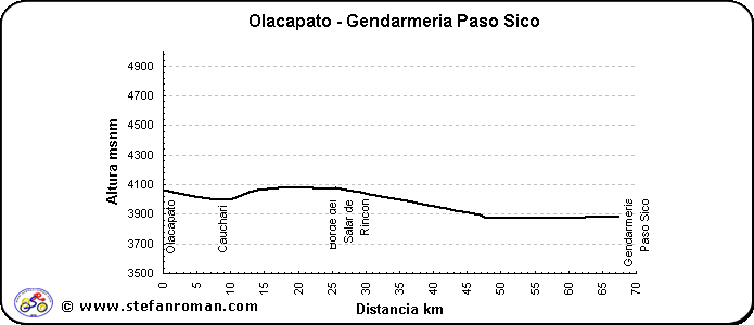 Diese Höhenprofile sollen als Orientierung bei der Planung der Andenüberquerung von Argentinien nach Chile über einen der schönsten Pässe helfen. Diese Erhebungen habe ich während einer Fahrradtour 2003 gemacht. Höhenangaben haben wegen atmospherischen Druckveränderungen einen Tolleranzwert von ± 150 m. Die Distanzen sind ziemlich genau. Geht immer sicher dass ihr genügend Wasser und Proviant dabeihabt, da die Gegend sehr dünn besiedelt ist und sich dass Wasser aus Bächen und Lagunen nicht zum Trinken eignet.