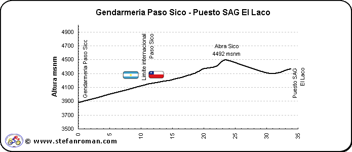 Estos perfiles de altura pudieran servir para la planificacion de una travesia en bicicleta de la cordillera de los Andes entre Argentina y Chile por el Paso Sico. Hice estas medidas durante un viaje en 2003. Las indicaciones de las alturas podrian variar ± 150 m dado a cambios de presion atmosferica. Las distancias tendrian que tener una tolerancia minima. Asegurense siempre que tienen suficiente agua y comida, dado que la region es muy poco poblada y el agua de los arroyos y lagunas no es recomendable para tomar.