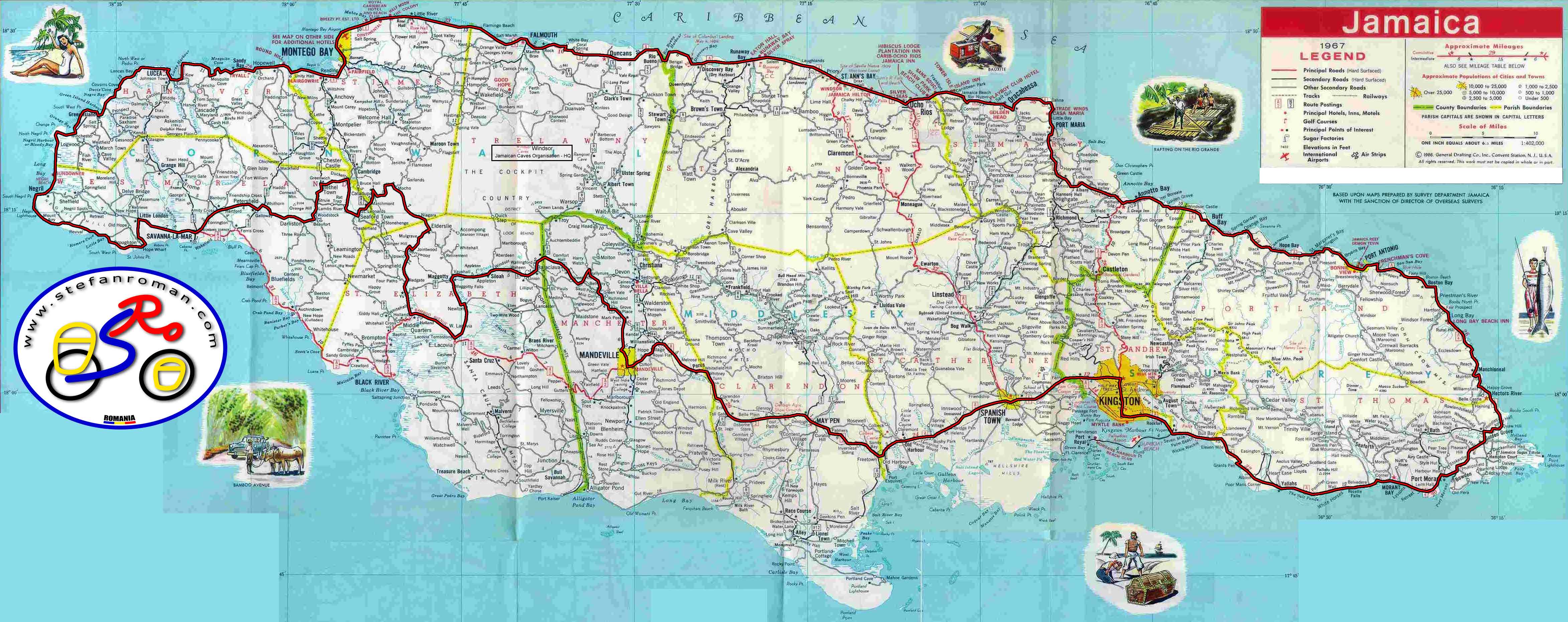 Spre surprinderea mea, drumurile din Jamaica sunt cu puţine excepţii toate asfaltate. Si în interior toate satele sunt legate între ele cu câte un drumuleţ. Din păcate nu-s toate semnalizate, aşa că la tot pasul trebuie să între încotro să o iau. în Seaford Town mă surprinde prezenţa multor albi. Este un sat cu mulţi descendenţi germani veniţi aici în urmă cu două secole, care trăiesc din agricultură şi duc o viaţă deloc mai privilegiată decât cea a jamaicanilor negrii. în această zi nu ajung prea departe, fac doar 30 de km. La Croyden in the Mountains, o plantaţie de ananas şi fructe citrice l-am întâlnit pe Mr. Hanna, proprietarul moşiei. Cum m-a văzut că sunt cu bicicleta m-a şi întrebat dacă nu doresc să-mi pun cortul undeva pe plantaţie, scurt după care mi-a oferit casa lui de weekend pentru a mă odihni până următoarea zi.