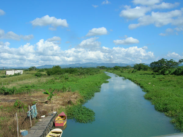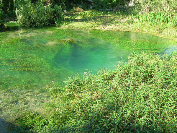 în Sav(anna) la Mar cumpăr pedale noi, una era deja ruptă. Beau primul ginger beer cu sorrel, destul de iute dar îmi face bine la gât, parcă am răcit în prima noapte la guesthouse din cauza ventilatorului. E o zi caldă. Pe lângă o plantaţie de trestie de zahăr ajung la Roaring River, un izbuc cu o culoare impresionantă. Nu stau prea mult aici, tot apar rechini (aşa le zic eu localnicilor care se agaţă de turişti şi vor se le fie ghid sau să le vândă ceva) şi vreau să ajung în munţi. Din Whithorn începe o urcare de 15 km până după Darliston. Fac multe pauze pentru a sta la poveşti cu cei care stau pe marginea drumului.