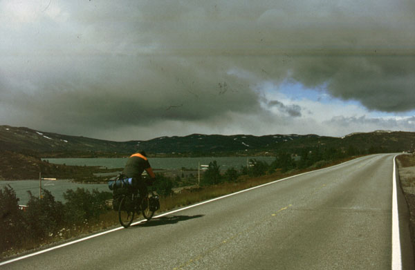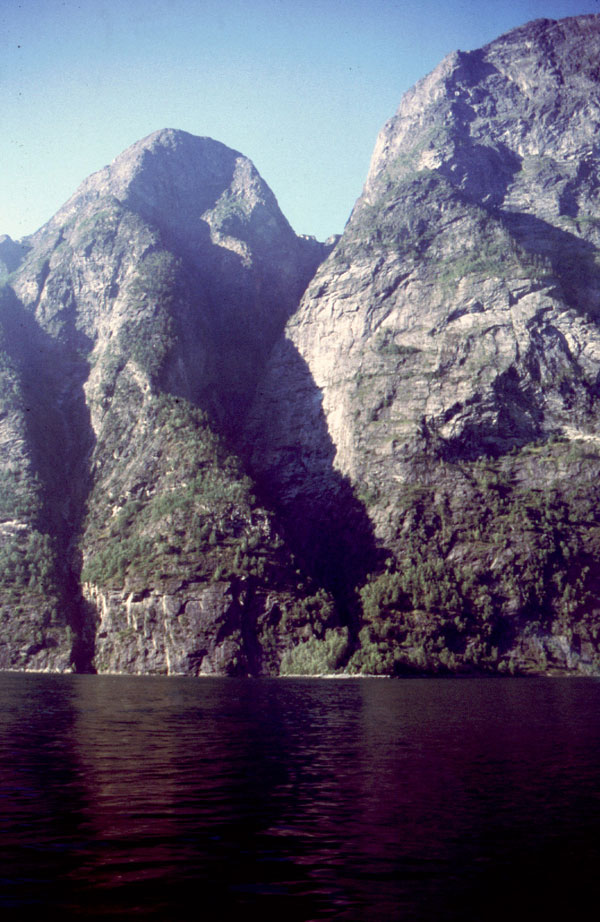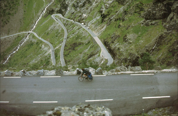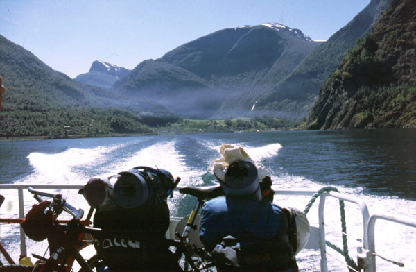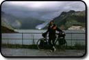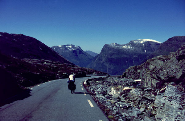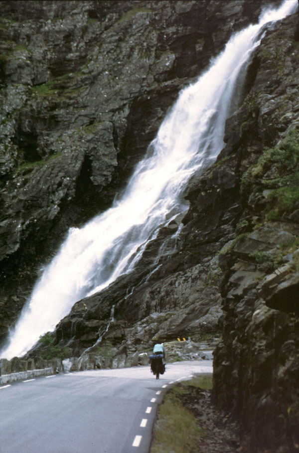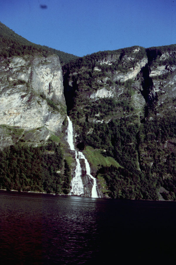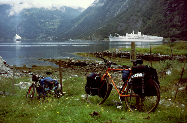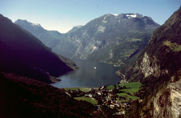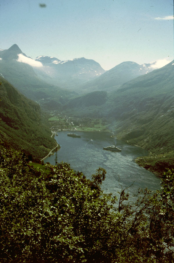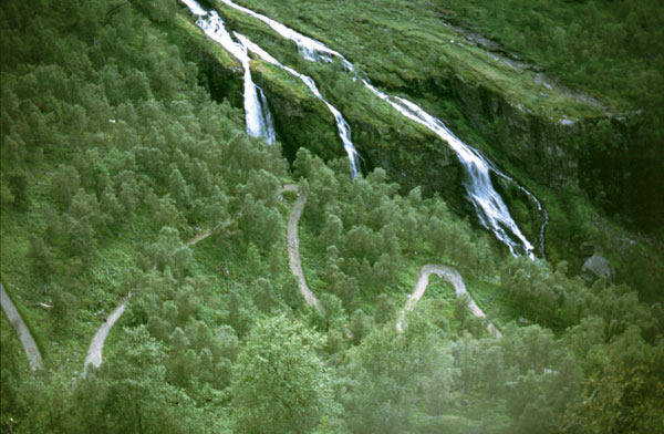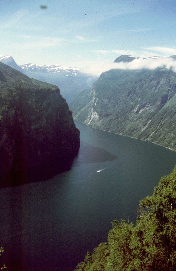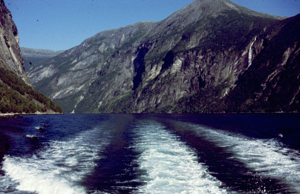 Noi suntem tocmai intr-unul din cele mai splendide locuri din lume. Suntem pe Geirangerfjord. De aici, la nivelul mării, avem de urcat 1000 m, un pas numit Trollstigen cu priviri spectaculoase asupra fjordului, a unor cascade care cad în mare şi asupra vârfurilor ascuţite din jurul fjordului. (1990 km pana azi).