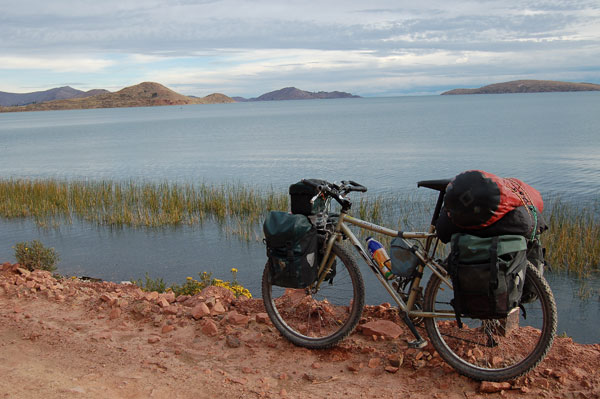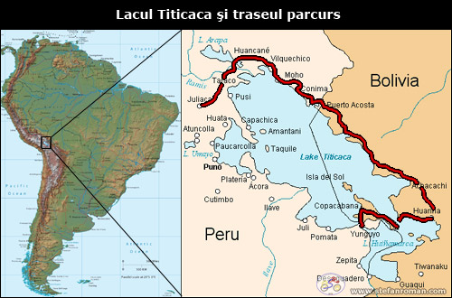 Cinci ore cu autobusul din Arequipa ma aduc la ora unu noaptea la punctul de pornire a turei mele, Juliaca, oras situat în apropierea malului de sud-vest a lacului. Gasesc o camera curata si ieftina într-un hostal din apropierea pietei unde ma cazez. Dimineata fac cumparaturile - legume, fructe si condimente - si vulcanizez roata din spate. Este o zi de sâmbata si parasesc rapid orasul aglomerat, zgomotos si murdar. La nici trei km dupa oras ma aflu din nou în linistea altiplano-ului, pedalând pe soseaua spre nord dea lungul careia pasc lame, alpaca, vaci, oi si magari. Familile care au teren sunt pe câmp si lucreaza. Dupa Huancane, la 65 de km de Juliaca, coborând o mica panta se deschide orizontul si drumul se apropie de malul lacului. Desi eram obosit dupa câteva ore cu vânt din fata, o euforie s-a declansat în mine vazând din nou oglinda infinita a lacului si insulele din larg, scaldate în calda lumina a soarelui la apus. Dupa ce mi-am ridicat cortul pe una din pasunile de pe malul lacului, momentul apusului era perfect. Doar zecile de camioane si autobuse care veneau cu marfa de contrabanda din Bolivia deranjau din când în când aceasta liniste. Un ceai cald, niste macaroane cu sos de legume proaspete si cascaval sunt rasplata culinara zilnica, dupa care urmeaza noua pâna la zece ore de somn în adapostul cortului. Prima ploaie dupa cinci luni jumate pe care am prins-o în sudul Peru-ului, anunta începutul sezonului ploios si deci un nou ciclu agricol pentru tarani, care harnici încep sa-si semene câmpul.
