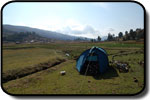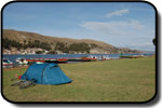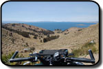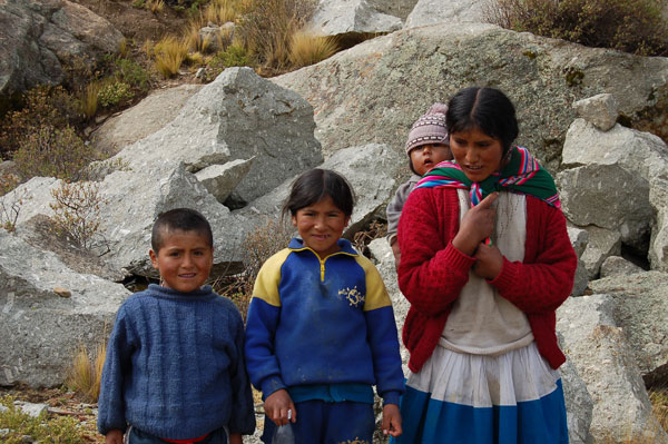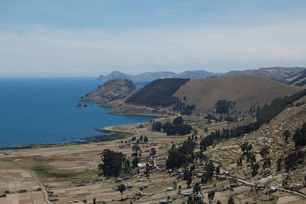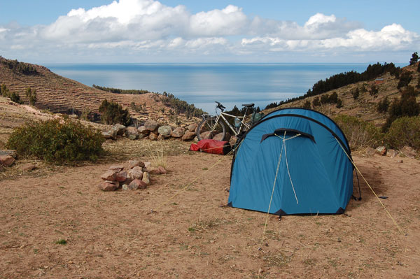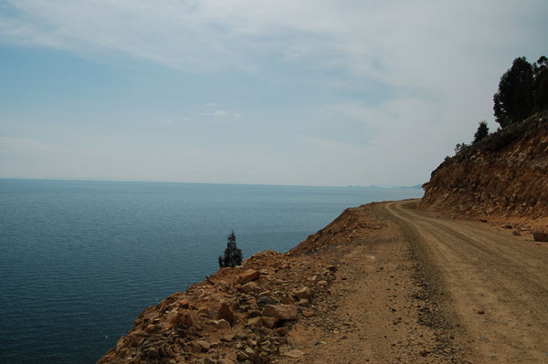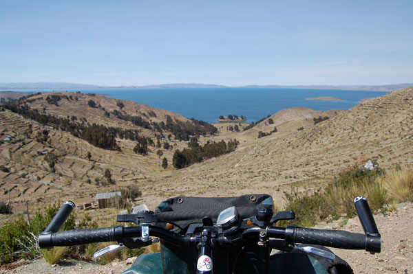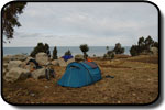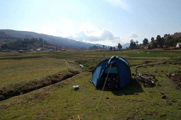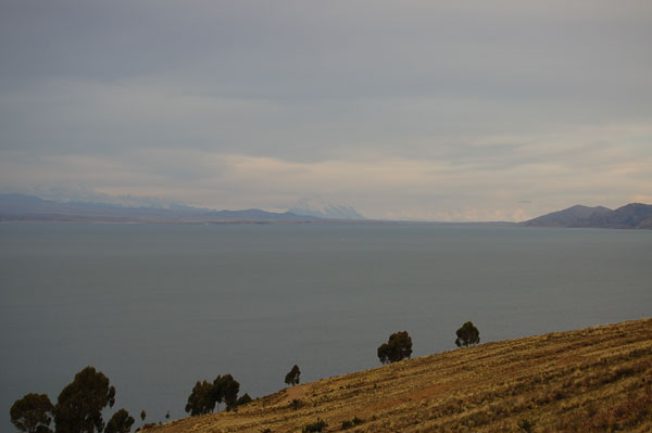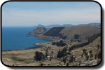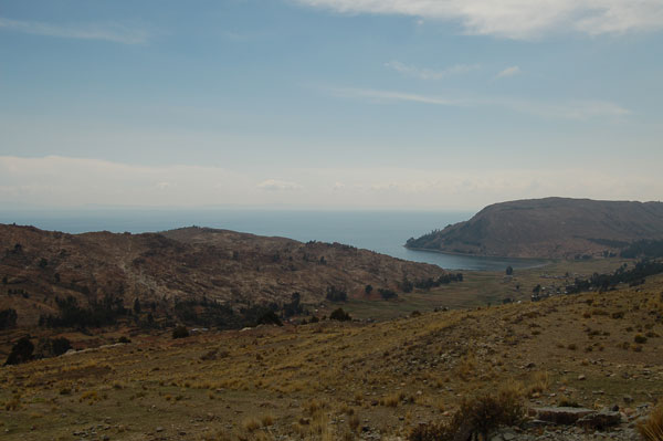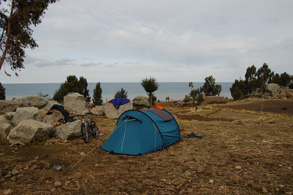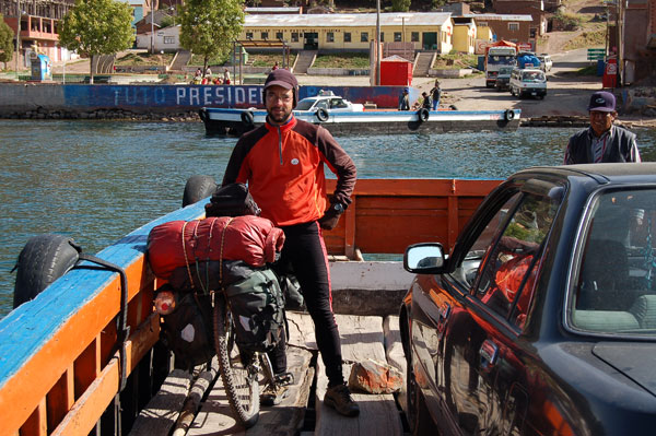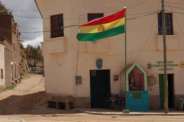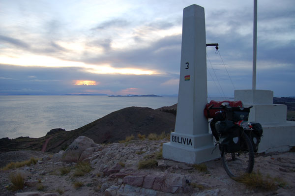 Ultimul sat peruan pe malul nordic al lacului este Tilali. Dupa doi km urmeaza vama peruana unde se afla doar un post rural al politiei care-mi stampileaza pasaportul. Frontiera, la doi km de postul politiei este semnalata de borna nr. 3. Cincisprezece km mai departe în Bolivia se afla satul Puerto Acosta, unde am ajuns abia urmatoarea zi. La fel, un mic post de politie de frontiera se ocupa de controlul persoanelor si-mi stampileaza pasaportul (istorie ce nu se termina aici). Din Puerto Acosta, drumul nu mai are urcari semnificative si continua prin numeroasele sate si satuce de-a lungul lacului. Dupa ce o ploaie torentiala de o ora m-a obligat sa caut adapost într-o scoala, ajungând sa fac ora de matematica cu copiii în urmatorul sat, Escoma, am dat de internet si m-am reconectat pentru putin la viata cotidiana, citind niste ziare si raspunzând la cele câteva mailuri primite nimic interesant, asa ca înapoi în realitate, un puternic vânt de spate ma împingea si mai repede spre est. Ajuns în Carabuco, mare petrecere cu ocazia sarbatorii satului, lume "vesela" pe strazi asa ca din nou dispar rapid si-mi gasesc scurt înainte de apus un loc de cort cu o priveliste ideala spre lac. Ce moment de satisfactie din nou când sunt în cort se opreste suieratul vântului, e liniste si cald si surpriza cea mare mai urma sa vina. Ca si în noptile trecute, a început sa ploua, dar de data asta parca ma aflam sub un bazin care se golea si în scurt timp, pe toata panta unde mi-am instalat cortul curgea o pânza de 5 cm de apa, inclusiv pe sub cortul meu care s-a transformat în pat de apa. Surpriza placuta a fost ca nu a intrat un strop de apa în cort si totul a ramas uscat pentru care recomand fiecaruia sa folosesca cu încredere un nylon de protectie sub cort.