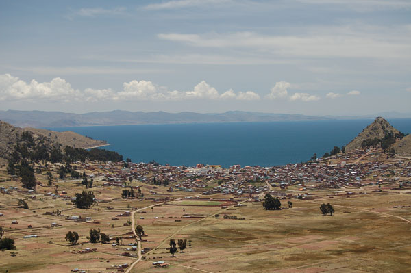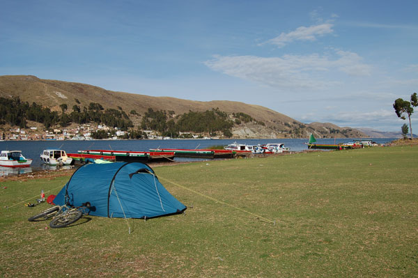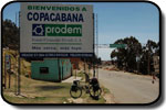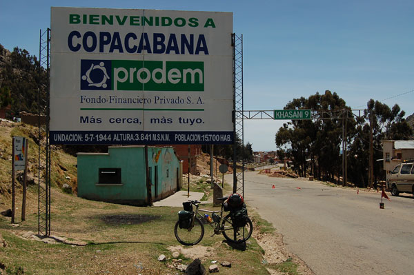 Ultima noapte din tura am campat pe gazonul terenului de fotbal din strâmtoare. O seara cu meritatele paste cu sos de legume, o noapte fara ploaie si o dimineata însorita au fost premiul pentru efortul depus. Cu un mic bac am trecut strâmtoarea si am început lunga si lina urcare de 30 de km pâna la o altitudine de 4200 m, pasul de unde se coboara din nou la nivelul "marii" în Copacabana orasel de pelerinaj ce adaposteste Fecioara de la Copacabana (Virgen de Copacabana). Este deasemenea portul de unde pleaca barcile spre Isla del Sol si Isla de la Luna, situri rituale considerate leaganul culturii incase. în consecinta, orasul are un caracter turistic, cu o serie de hostaluri, restaurante, agentii de turism si magazine cu suveniruri.