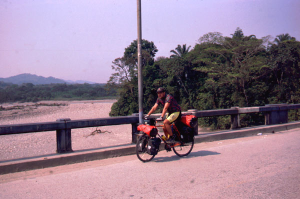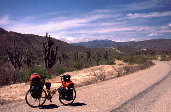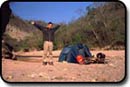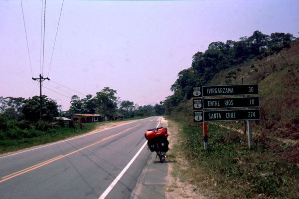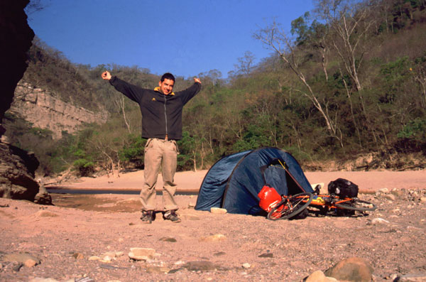 Drumul incoace a fost destul de greu. Am plecat marti din Santa Cruz si am facut 70 km. Mi-am pus cortul in albia unui rau, nisipos dar frumos, numai ca si vantul a inceput sa bata. Dupa ce m-am pus sa dorm a venit o rafala si a doborat cortul peste mine, a trebuit sa-l ancorez in bicicleta si sa car bolovani ca sa am unde fixa cuiele. A fost prima noapte in cort in Bolivia, deasemenea si prima noapte in cortul nou. E fain, putin cam mare, dar am loc sa ma intind.