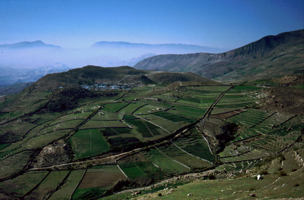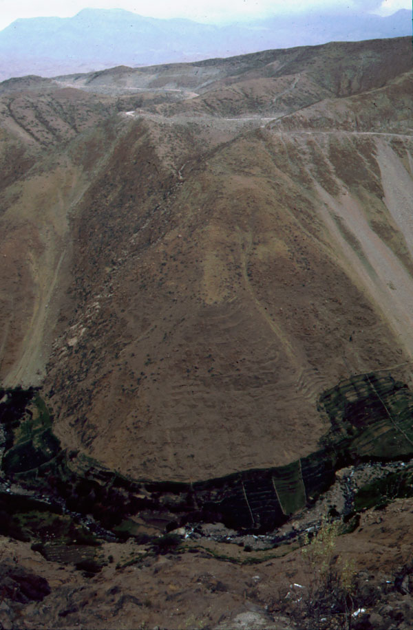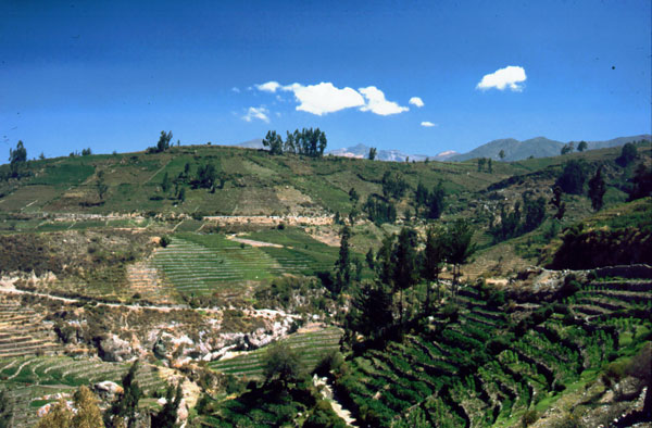 Doua posibilitati aveam de aici mai departe spre Mazo Cruz - una directa, cu 60 de km de urcare pana intr-un pas de 4770 m, dar cu putin trafic si starea drumului proasta din cauza ploilor, sau cu ocolire prin Candarave. Am ales a doua posibiliatate, fiindca treceam prin mai multe sate si aprovizionarea cu apa era mai sigura. Va spun ca aceasta parte a fost una dintre cele mai interesante. Peisajul cultural este impresionant - incasii au terasat aici aproape fiecare vale. Aceste vai fertile aprovizioneaza toate regiunile joase dinspre pacific, unde agricultura este imposibila, doar pe firul unei ape. Cand drumul urca la inaltimi de peste 3500 m si toate terasele, cu taranii lucrand terenul si boii arand parcelele se indeparteaza in adancul vailor - pentru mine este o recompensa pentru toate greutatiile urcarii sa am asa o priveliste, atat de pasnica si placuta. Mai ales cand te intorci spre munte, si vezi o creasta colorata in rosu, gri si verde, cu partile cele mai inalte inzapezite, norii acoperind cu forme diferite in fiecare clipa varfurile. Este de-a dreptul fascinant.