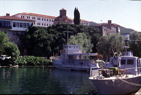 Trecerea peste această creastă spectaculoasă se face printr-un pas situat la 1650 m altitudine, după care urmează o coborâre în serpentine de 22 km până la mănăstirea Sveti Naum, construcţie în stil bizantin datând din sec. XIV. Am sosit chiar de ziua Sfântului Naum, prin urmare mănăstirea era invadată de pelerini veniţi din toate colţurile Macedoniei.