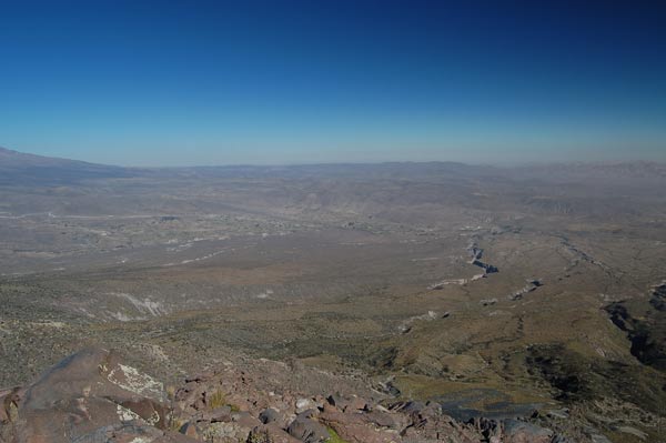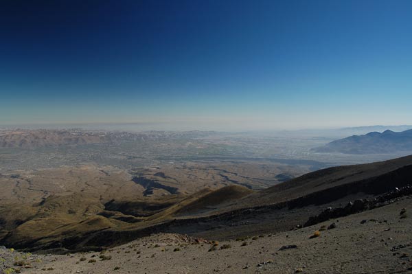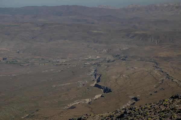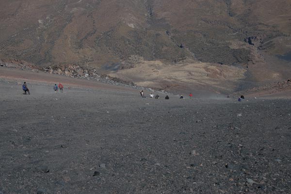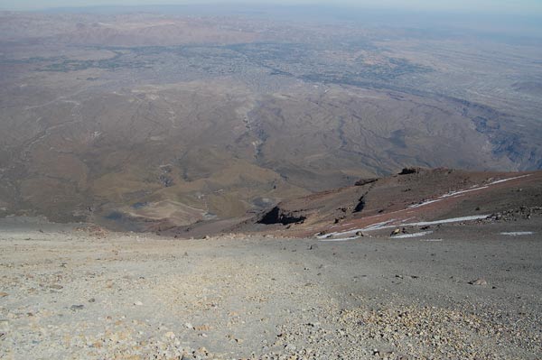 We took the obligatory summit photos and at 12:!5 we started the descend. Until the plain part at the edge of the volcano we took the same path, but from there we descended directly through the fine volcanic sand until reaching the base 40 minutes later. It's a strange feeling descending through this fine sand, as if you would ski in deep snow. We then packed our tents and backpacks and continued descending directly through the sandy valley and crossing then the grey sand dune to the little ridge which leads us to the place where the cars were waiting. As there was a free place in one of the cars, they gave me a ride to the center of Arequipa. This way, I didn't have to walk the 6 kms down to the main road.