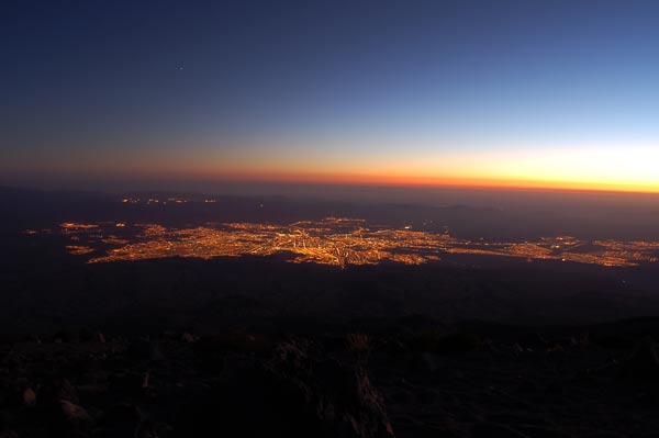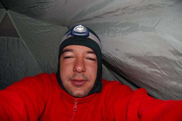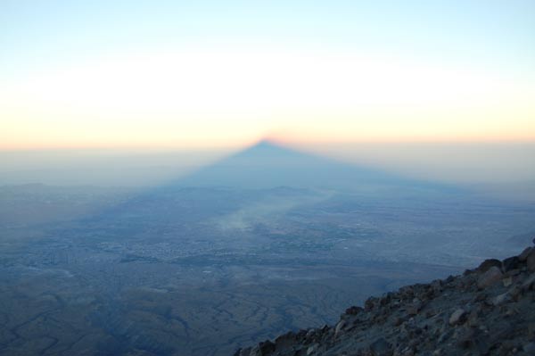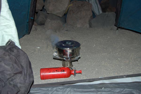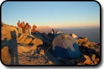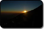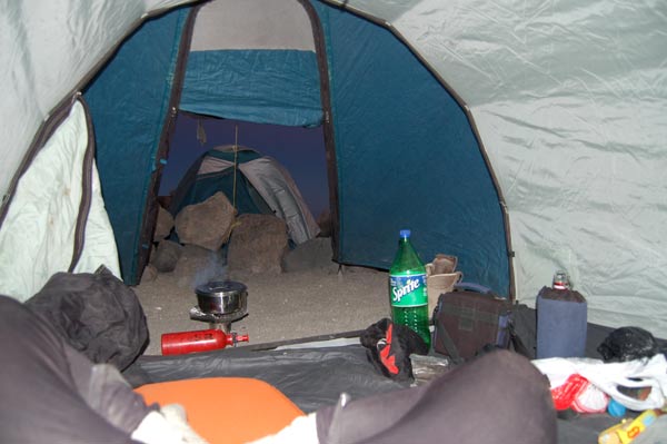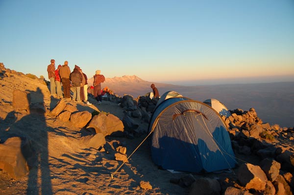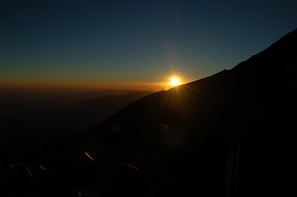 Gaining altitude, my breaths got deeper, the stepps smaller and my backpack heavier. The idea was to pitch up my tent together with the group and begin the climb next day with them. My breaks were getting more often and longer and in order to relax my back, I had to take of the backpack, movement that cost you precious energy. At about 4000 meters, I got sepparated from the group, but the guides described me the place they would pitch up their tents. From basecamp 1 I could see them taking the path to basecamp 2 and arriving there, pitching up the tents. The path leads on the right part of the rockfield in front and brings you to a little plain, where you can camp. The altitude difference is of 150 m at a distance of aprox. 800 m. Unfortunatelly, I lost the path and had to climb directly. This was the toughest part of the whole day. In less the an hour (at 5 PM) I reached the camp and after getting my tent ready, I prepared a warm meal. The spectacular sunset and the view over the light scattered town compensate for the hard climbing this day. The temperatures falls rapidly after the sunset and the harder blowing wind force you to get into your tent. From basecamp 2 you need usually 6 hours of climbing to the summit.