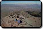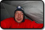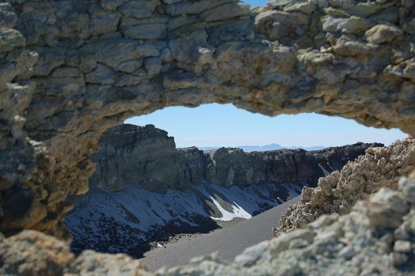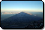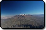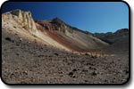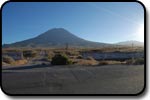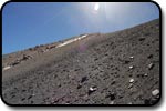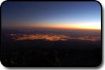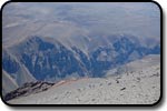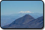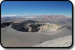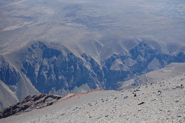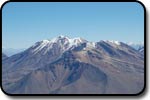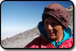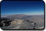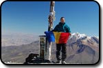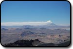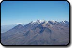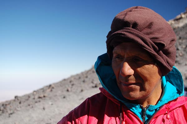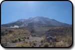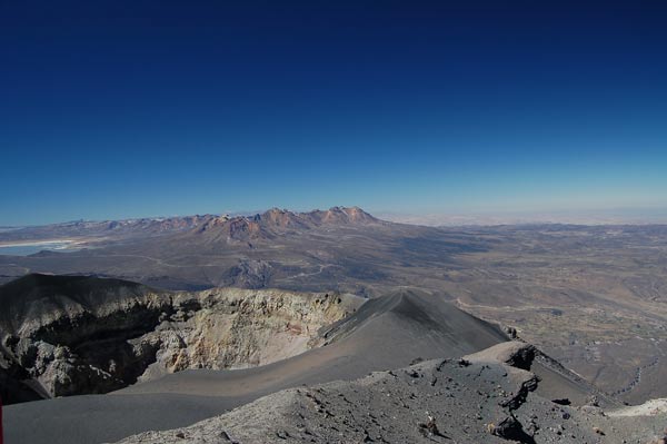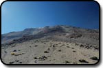Hardly anybody could sleep this night. Although I had my eyes closed all the night and was very tired after this long day, I couldn't get asleep. I had some coughing too and had to clean my nose all the time, not being sure at the time I was prepareing my bag wether I could make the climb or not. I got up at 2:30 AM, prepared a hot tea and some breakfast and waited until the group was ready to go. They offered me a hot tea before starting and at 3:30 we were ready to do the final climb to the summit of El Misti. The path climbs the rocky ridge behind the basecamp until the exterior edge of the crater at 5650 m, which we reached at 10:30. From here, you cand already recognise the cross on the top of the volcano. Before climbing the last 200 m, we had a longer break to recover some forces. The landscape is getting more and more spectacular as we get closer to the summit. You can see on right hand the ash-spitting volcano Ubinas, at left hand snowcapped peaks of the Cordillera Chilca, the Coropuna and the "neighbour" Chachani.