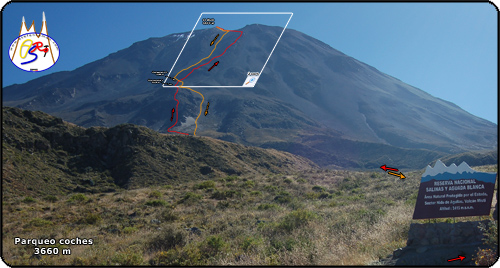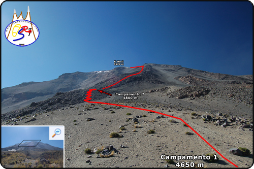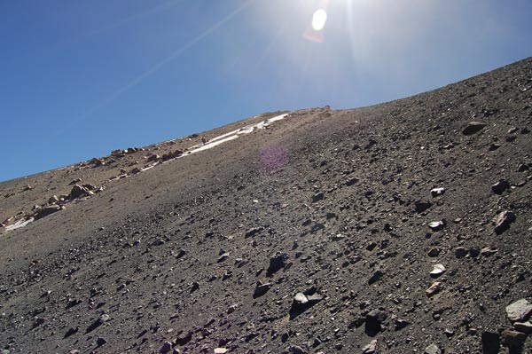 The path begins at the car turning point and goes slightly uphill for about 40 min. Then you have to cross left hand a valley and continue the climb. Further on you can recognise a grey sand dune which you have to cross to the left to reach the rocky ridge which you have to climb until arriving to the 1. basecamp. Take care not to loose the path, you have to climb all the way up. From the first basecamp you can recognise a second rockfield. Just behind (on top of) this field lies the second basecamp. At this altitude you can feel the lack of oxygen. I did a great part of the climbing alone, reaching the group just when they were having a break, as they were less tired and were carrying less stuff.
