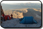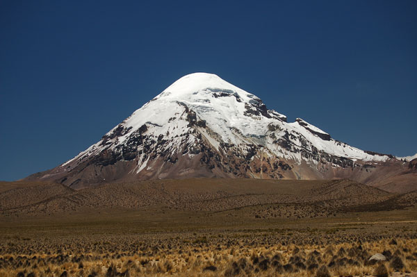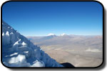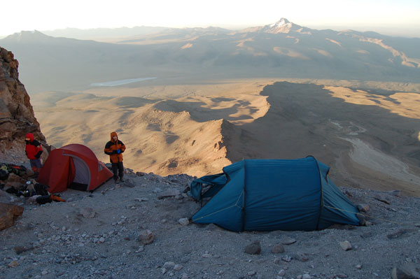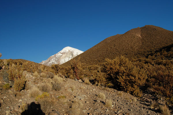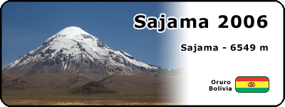 La 8 dimineata am plecat din sat (4200 m). Primii km se fac pe drum, după care pe o vale largă se începe apropierea spre baza vulcanului. Există două optiuni de a urca Sajama. Una este cea de trei zile, în care prima tabără se face la altitudinea de 4800, la 5 ore de mers din sat, după care în a doua zi se urcă la tabăra de bază aflată la 5600 m. Cei doi au optat pentru a doua optiune şi anume de a urca direct în tabăra de bază ceea ce ne-a costat o mare cantitate de energie deja în prima zi. Mai ales ultima parte, ultimele 2 ore care se fac pe un grohotiş foarte abrupt m-au obosit. Fiecare pas era de fapt o jumătate de pas fiindcă alunecam înapoi. Iar în ultima ora a şi început un vânt aşa de puternic, încât trebuia să stau jos din când în când pentru a nu mă dezechilibra. Eu iarăşi am fost dotat cu tot echipamentul de camping (cort, sac de dormit, izolir, primus etc.) şi nu aveam cu cine să-l împart. Am ajuns cu vreo jumătate de oră după David (australianul) şi Mario (ghidul ) în tabăra de bază (9 ore), care constă în 4-5 locuri de cort terasate într-o mini şauă de pe creasta de urcare. Atâta doar că locul pentru cortul meu nu era destul de mare şi a trebuit să-mi maresc una dintre terase pentru a întinde tunelul meu... dar după ce ştiam odată că nu mai am de urcat în ziua aceea, nu mai conta şi efortul acesta. Cu cortul întins, zăpada topită pentru apă şi bagajul pregătit pentru noaptea următoare am încercat să mă pun la culcare pe la ora 20. Totuşi n-am reuşit să adorm fiind neaclimatizat pentru astfel de înaltimi. Solutia în situatii din astea este o aspirină, care ajută la alivierea simptomelor de hipoxie, una dintre ele fiind insomnia.