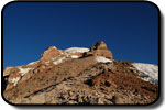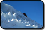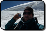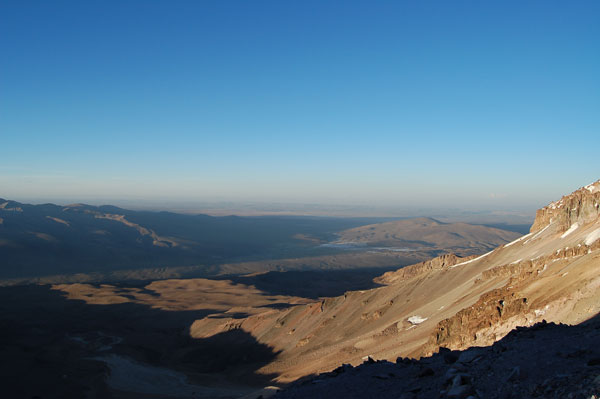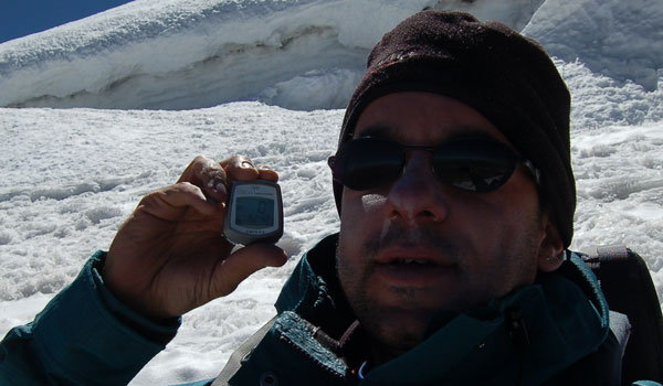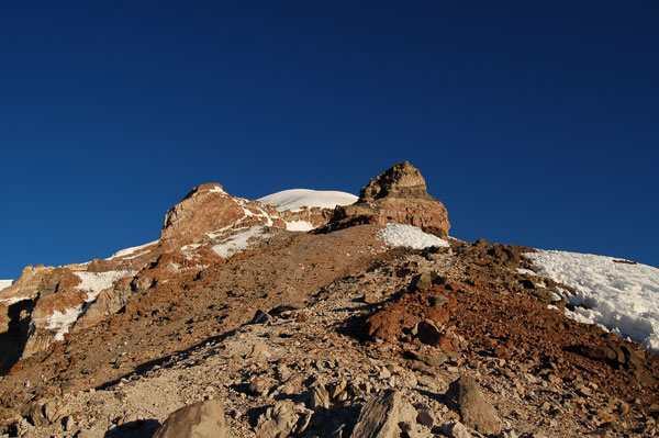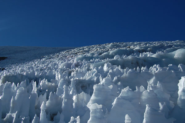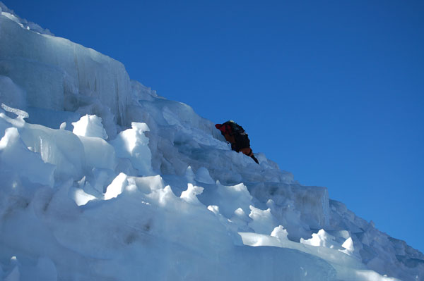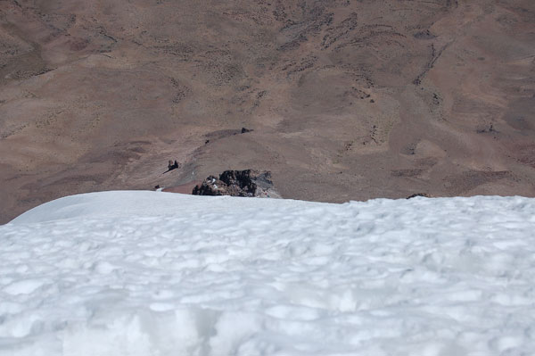 Dacă am trecut de penitentes nu înseamnă că am scăpat de greu. Acuma avem de traversat pentru 100 de metrii diferentă de nivel nişte trepte de gheată, ca niste gururi supradimensionale. Această portiune ne ia definitiv ultimele forte pentru a urca spre vârf... într-un moment când nici moralul nu mai era sus. Urcarea de aici este simplă, o pantă înclinată cu zăpadă tare. Trebuia luată o decizie: de a continua urcarea şi să ajungem pe vârf pe la ora 14, coborând la cort pe zăpadă moale şi prin băltile ce urmau să se formeze pe treptele de gheată, sau de a ne întoarce. Asta în contextul în care nu mai aveam destul combustibil pentru a topi zăpadă şi nici destule alimente pentru încă o zi în tabără. Mi-am zis ca merită încercat dacă am ajuns deja până aici, însă nu mai aveam mult timp pentru a ne odihni, deci trebuia să mergem într-un ritm constat şi cât mai grăbit. Însă mai mult de o oră n-am rezistat, am ajuns pur şi simplu la limita fortelor mele. Genunchii îmi tremurau şi trebuia să-mi păstrez un minim de energie pentru a coborî în conditii de sigurantă. Le-am zis lui David şi Mario că-i voi aştepta în acel loc, la 6250 m, şi în cazul în care îmi revin peste 20 de minute, continui şi eu. Nici ei doi n-au făcut mai mult de 20 de paşi, văzând o nouă pantă parcă interminabilă la capătul căreia se află primul dintre cele 2 vârfuri "false"... Ne-am luat timp pentru a ne poza în toate pozitiile, la fel de mândrii ca şi cum am fi ajuns pe vârf. Ne-a luat apoi nu mai putin de 4 ore de ajunge din nou la corturi, coborârea peste penitentes şi treptele de gheată nefiind cu nimica mai uşoară decât urcarea.
