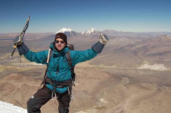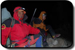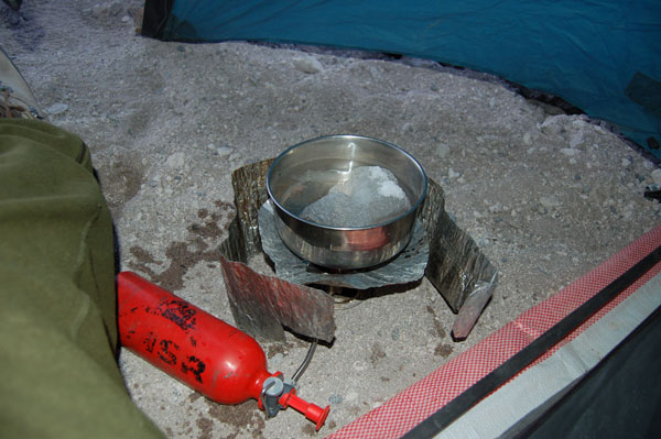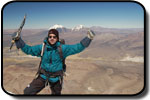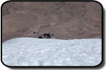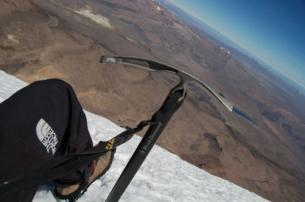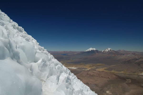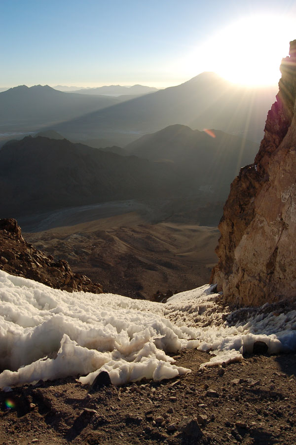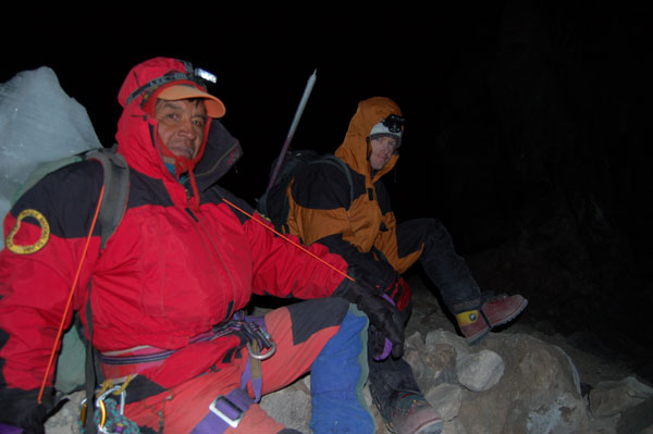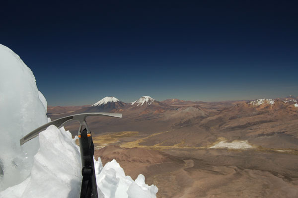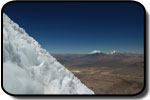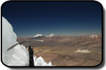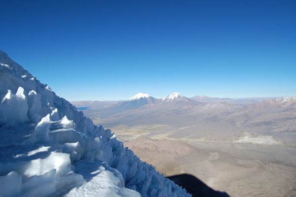 La ora 1:30 eram deja echipat şi pregătit de plecare. Ghidul însă îmi spune că el încă n-a topit zăpadă pentru a-şi face apă şi că mai trebuie să aştept... timp de o oră jumate. Plecăm aşadar la ora trei dimineata, ne aşteptau deci aproape 1000 de metrii diferentă de nivel, de la 5800 pe gheată. Mai întăi se avansează pe creasta de nisip şi pietre, apoi după un traverseu apare în acest sezon un câmp de penitentes. Penitentes-i sunt ca nişte lapiezuri de gheata, formati prin eroziunea şi topirea ghetii. Este o formă de eroziune întâlnită doar în zone tropicale, doarece unghiul de incidentă a razelor solare contribuie decisiv la acest tip de eroziune. Deja guardaparque-i mă avertizau că sezonul de escaladare s-a încheiat cu o lună în urmă şi că aceste câmpuri de penitentes îngreunează foarte mult înaintarea. Fapt şi confirmat la fata locului, doar că aici a venit marea supriză. Mario, ghidul, nu mai vroia să continue, motivând că este obosit şi că nu are rost să încercăm trecerea peste penitentes fiindcă ne-ar lua foarte mult timp. Aici au început discutiile şi amenintările, strategia ghidului fiind una foarte clară: să aibă o zi de muncă cât mai uşoară. După jumate de oră de discutii am continuat drumul prin primul câmp de penitentes de care am trecut în 40 de minute, zonă care în conditii normale ar fi fost traversată în 10 minute. Urmează o parte mai uşoară, pe pietre şi nisip, după care din nou ne legăm în cordă pentru a trece un ultim traverseu pe un perete. De aici începe un nou câmp de penitentes, înalti de 1,20 metrii şi groşi, foarte greu de spart necesitând un efort fizic extrem de mare pentru a trece peste ei. După ce reuşim să trecem si de acest prag iese în sfârşit soarele şi ne încălzeşte putin. Suntem la 6000 de metrii, si soarele îmbracă în razele lui calde vulcanii de pe partea chileană, Parinacota şi Pomerape.